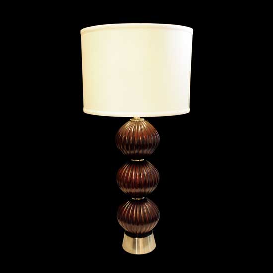 This is a classical table lamp designed for home use. It comes with a beige drum lampshade and a resin lamp pole accented with chestnut-like adornments, showcasing a sophisticated accent. This delicate desk lamp is great for add a touch of elegance to your living room.