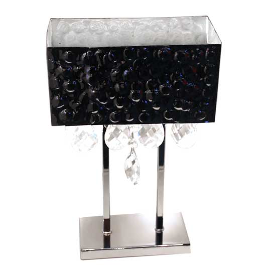 This modern table lamp features a black shade with dangling drop-shaped clear stones. The flat iron base showcases an elegant chrome finish. The stylish table lamp will enhance the beauty of your bedroom decor.