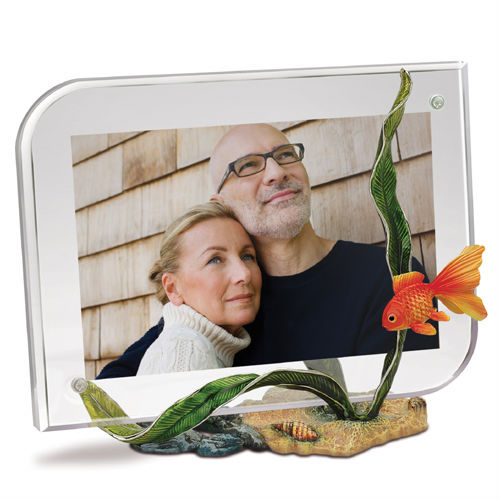Keep a good record of the most treasured moment of your life with this tabletop frame. The oblong picture frame stands firmly against a stone-shaped base and is fully embellished with nickel-plated goldfish and seaweed sculptures to inject a lively accent to your favorite family photo.