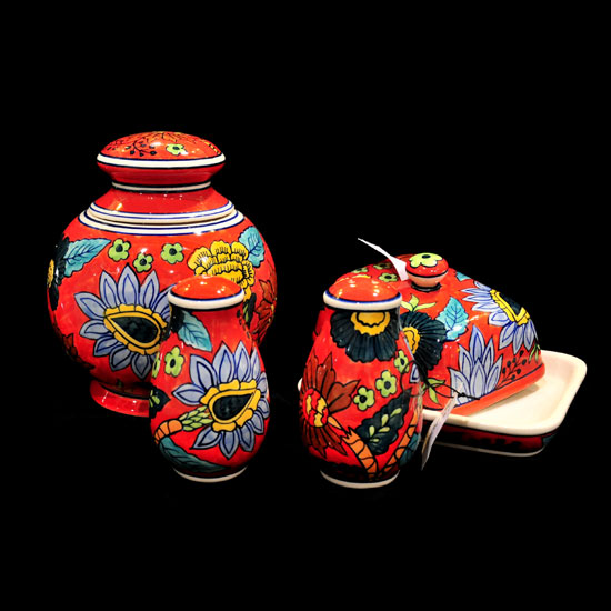 Picture is a set of beautiful tableware set in red background with various colorful floral patterns. It is made of endurable material which offers safe storage for food or seasoning. Add color and fun to your kitchen with this tableware set.