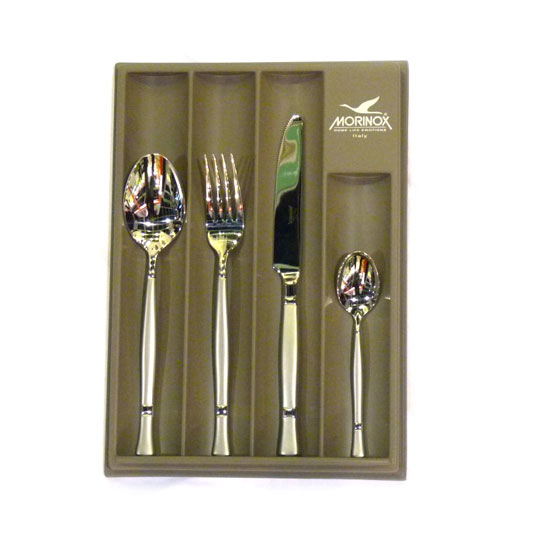 Shown here is a 4-piece set of tableware made of quality metal. The set includes is a teaspoon, a tablespoon, a knife and a fork for western dining. The handles of the flatware are crafted in a slim curvy shape to show an elegant style.