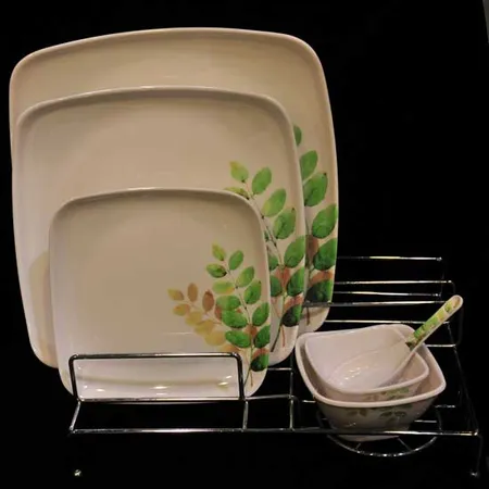 This tableware set comes with 3 plates and 2 bowls with patterns. The square-shaped dish and bowl help offer a chic touch to the setting. This tableware set is a nice choice for both personal and professional uses.