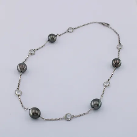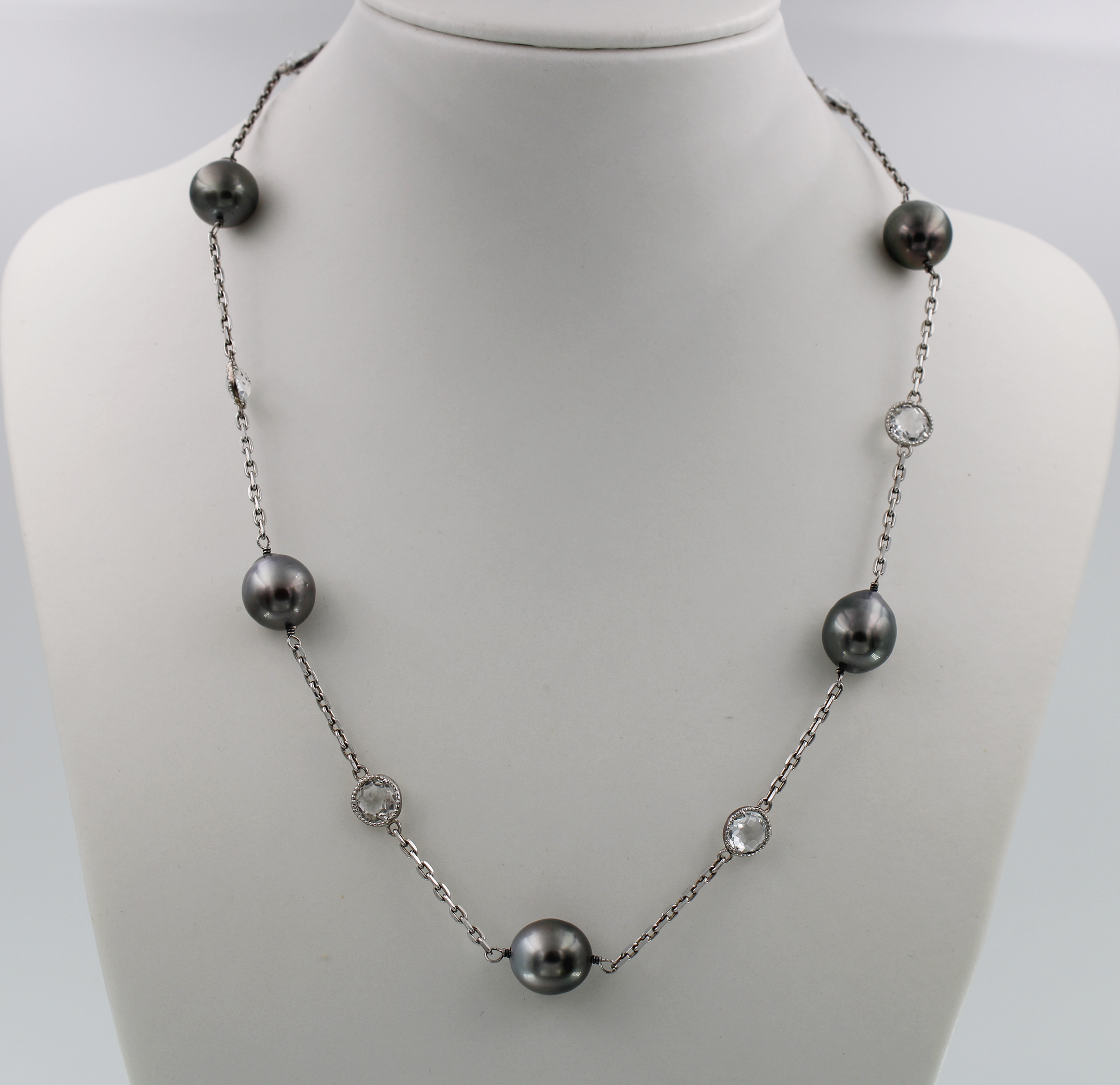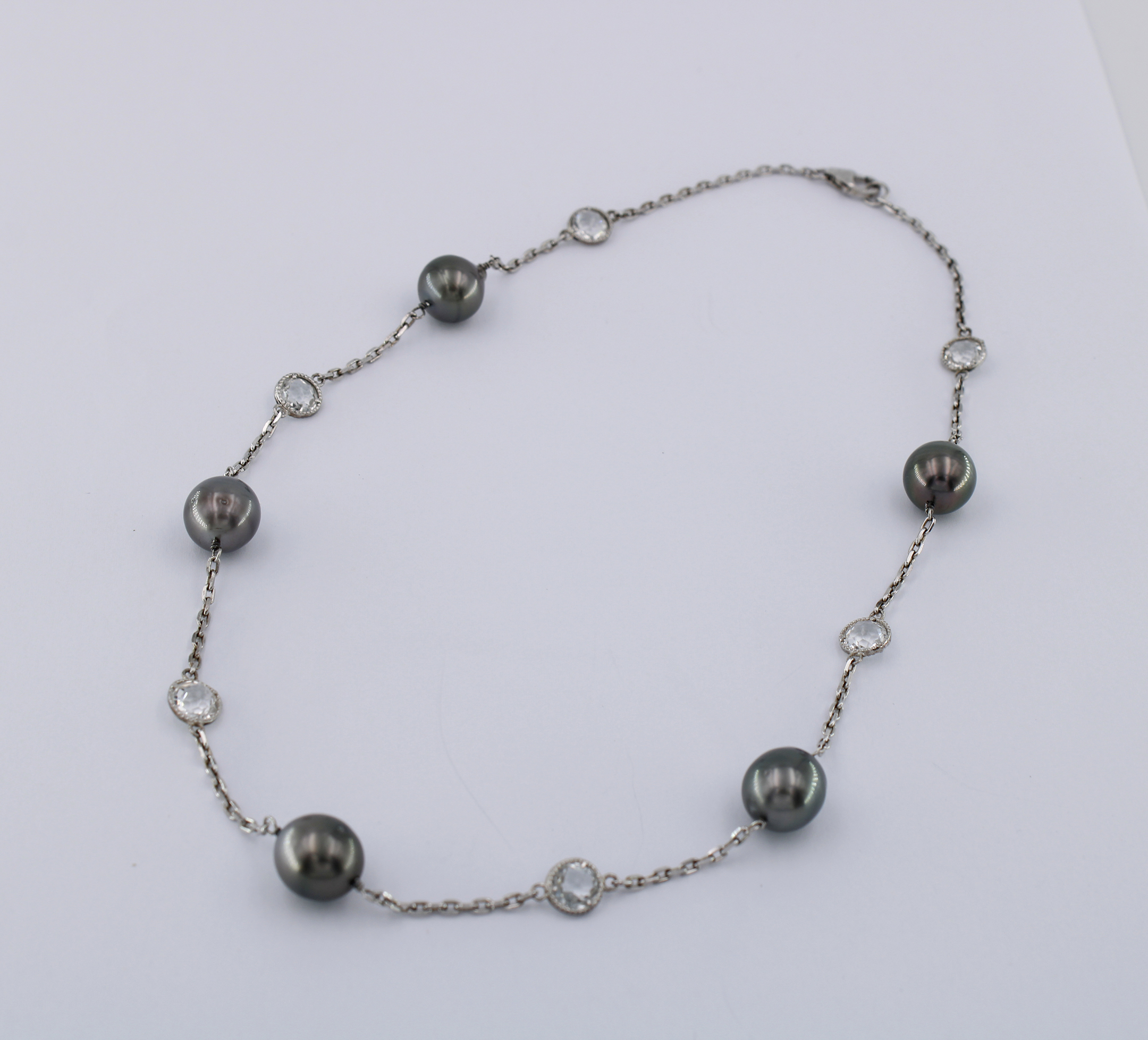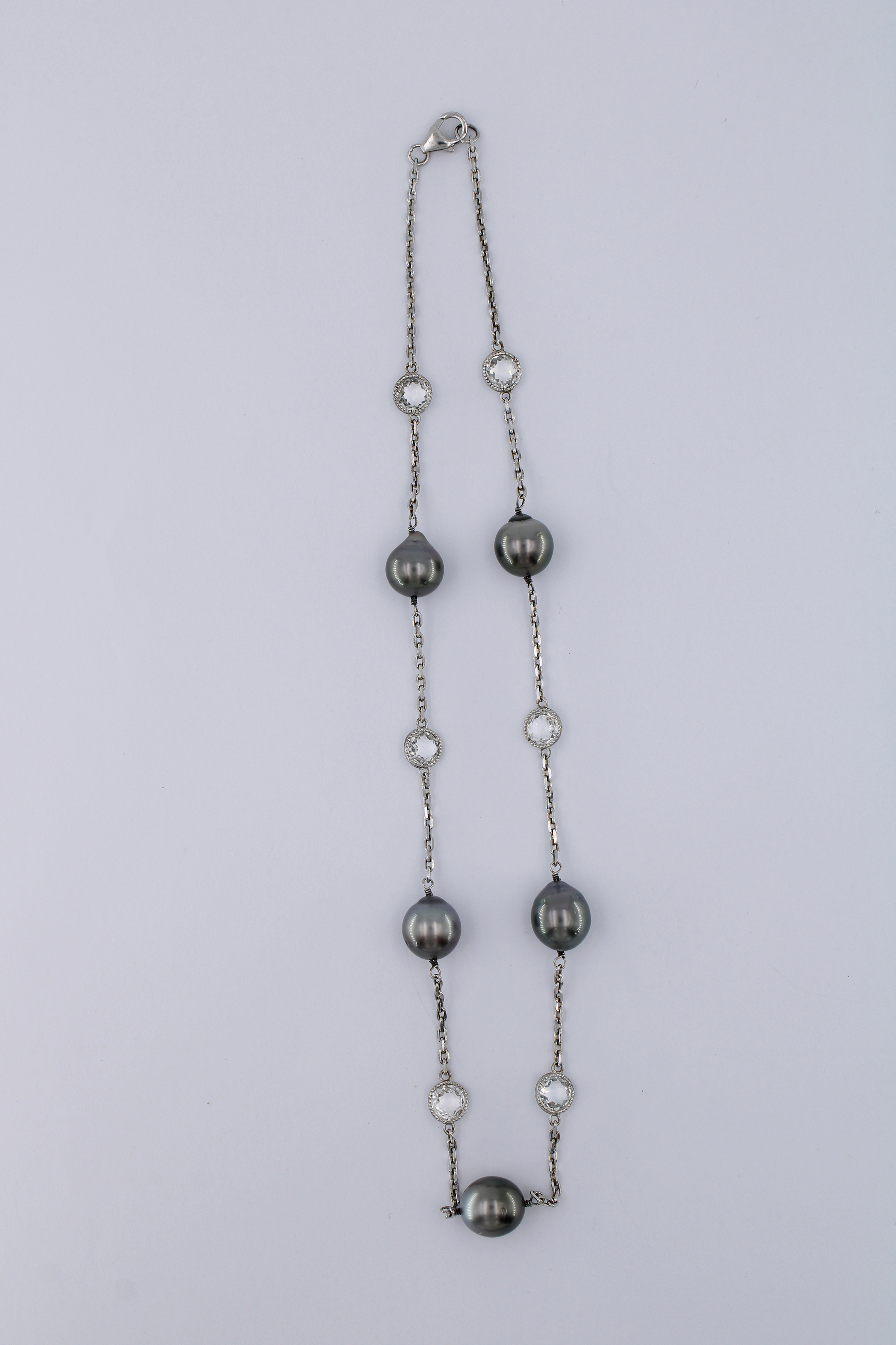 5pc. of 10-11mm Tahiti black screw pearls A grade, 6 pc. of 6mm round white topaz of double sharpe cut with silver setting, silver chain necklace 45cm length (including clasp), closing by 11mm 925 silver lobster clasp in rhodium plated without nickel.