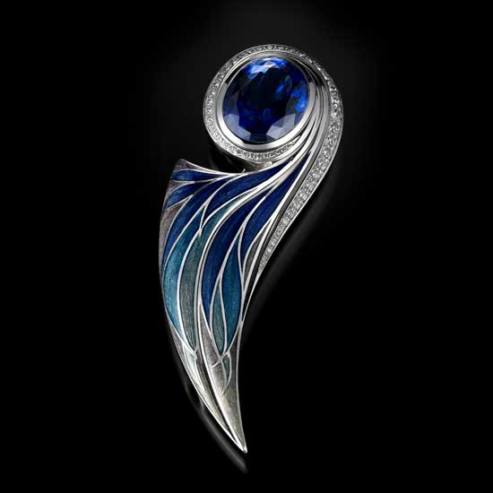 This beautiful and unique brooch features a wing design. The gorgeous jewelry brooch is accented with an oval-shaped tanzanite stone and many tiny white stones. The versatile brooch can also be worn as a pendant.