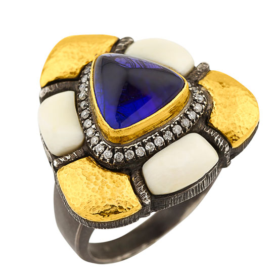 This sterling silver finger ring features a trillion-cut tanzanite that is encircled by diamond accents. The 24k gold details and walrus ivory embellishments enhance the ring's luxuriousness. This bold ring can be easily paired with gemset bracelets, leather wristbands, crystal watches and more.