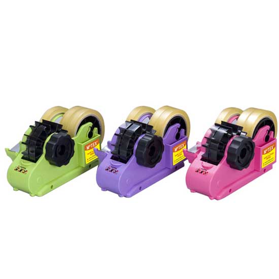 Shown here is a tape dispenser designed in a dual-roll style. The dispenser features a winding mechanism to handle different types of tape. This tape dispenser is an indispensable item in packaging.