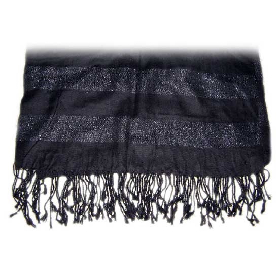 This tassel scarf is a functional and stylish accessory for jackets and coats in the winter. The black scarf is accented with silver glitter for added appeal. The top-quality scarf is ultra soft and lightweight.