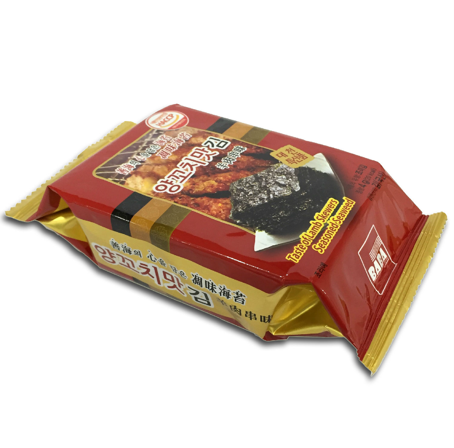 Ingredients: seaweed, corn oil, taste of lamb skewers condiments powder (refined salt, sesame, monosodium glutamate(flavour enhancer), cumin, black pepper powder, red chili seed powder, peanut powder), sesame oil caution(allergy):peanut