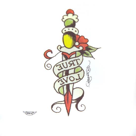 This is a tattoo sticker. This tattoo sticker has a dagger pattern with flowers decoration. There are two words "true love" which blends in the tattoo design.