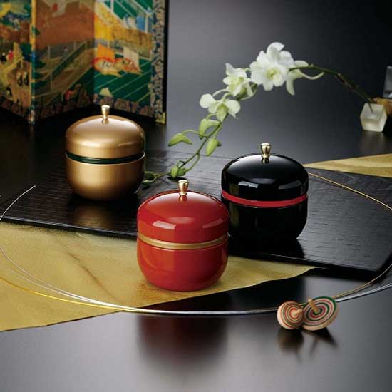 Displayed are tiny cans made especially for tea packaging. The cans are finely designed with a touch of Japanese-inspired style. The chubby profiles and glossy finishes add style to the cans.