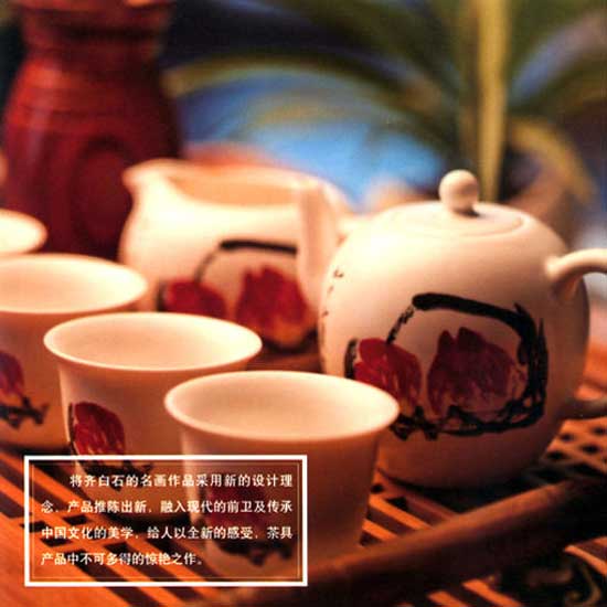Enjoy your favorite tea by using this exquisite set. The pieces feature the famous artist Qi Baishi's paintings on the surfaces. The high-quality set is easy to wash and maintain.