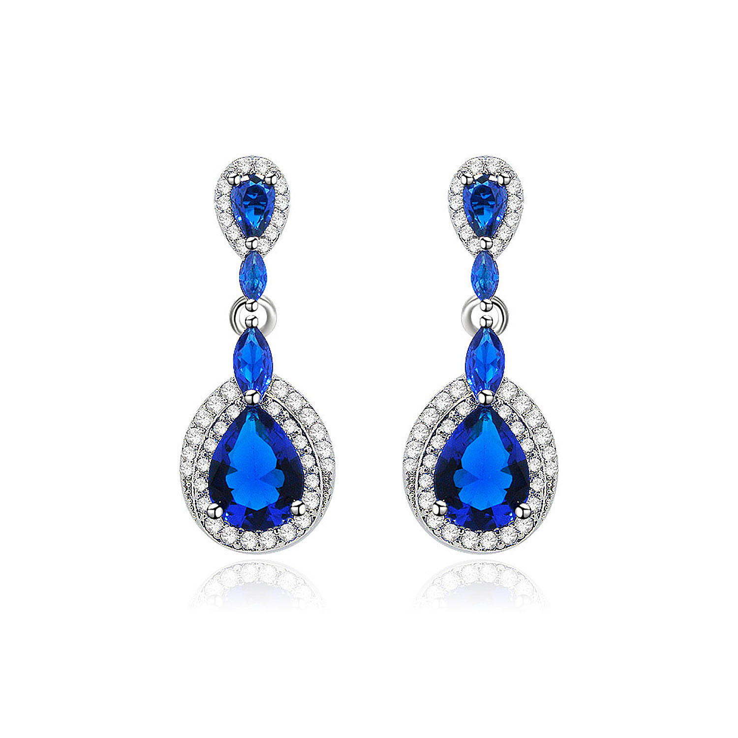 Add a touch of sparkle and look of cubic zirconnia with these classically designed framed pave cubic zirconia teardrop wedding earrings mixed with deep, sapphire blue stones. These earrings are great for the bride who wants a more petite, but sparkling earring design. Tear Drop Pear Cubic Dangle Earrings are perfect for any special occasion. All jewelry features high-quality electroplating and is nickel-free (hypoallergenic).
