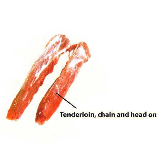Displayed is a piece of tenderloin pork from healthy pigs. Professionally cut, this tenderloin pork includes the chain and head. Once cooked, this tenderloin pork is juicy and tasty, making it a good choice for many dishes.