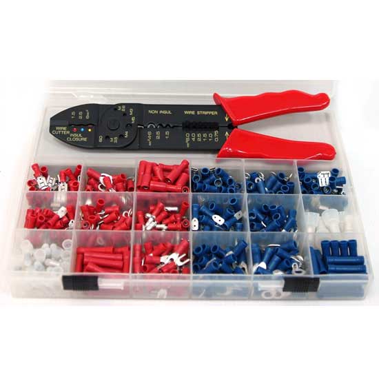 This terminal assortment kit comes with a practical multi-tool with wire stripper and cutter. An 18-compartment design allows for convenience storage. High-quality wire terminals are also provided.