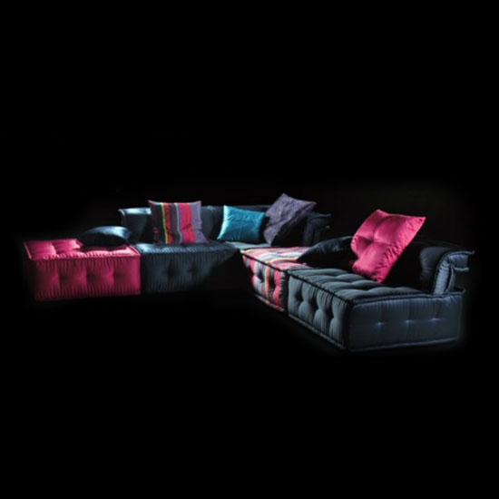 Featured is an upholstered sofa featuring a quilted shell. The shell of the sofa is made of quality fabric in a fresh combination of red, black and color stripes. The modern appearance brightens any styles of home décor.