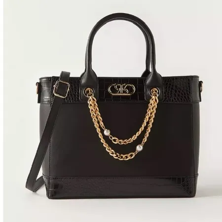 Satchel tote bag featuring multi-texture finish and an embellished chain accent. Comes with additional matching long strap for hands-free use, and secured with a single top zip closure. For more details please contact us directly.
