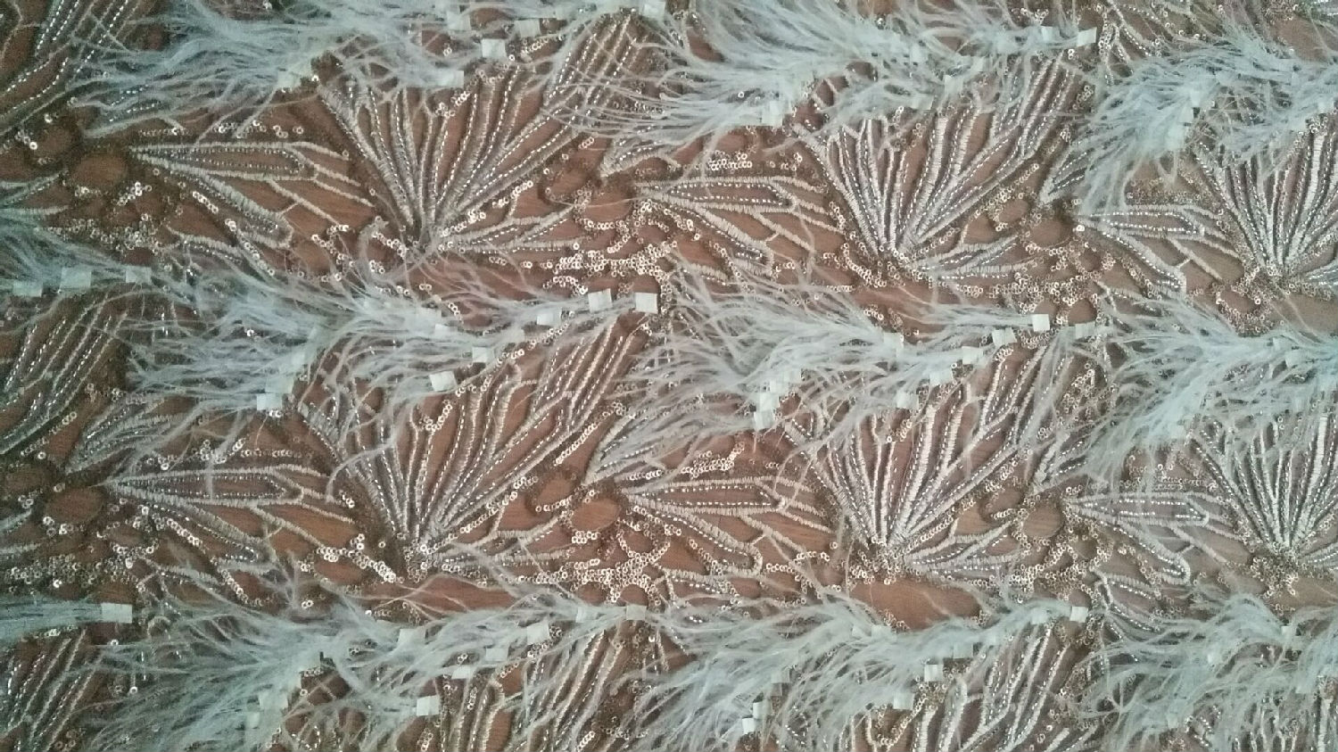 The fabric is embroidered with hand-made beaded tubes and ostrich hair, suitable for mid - and high-end dresses
