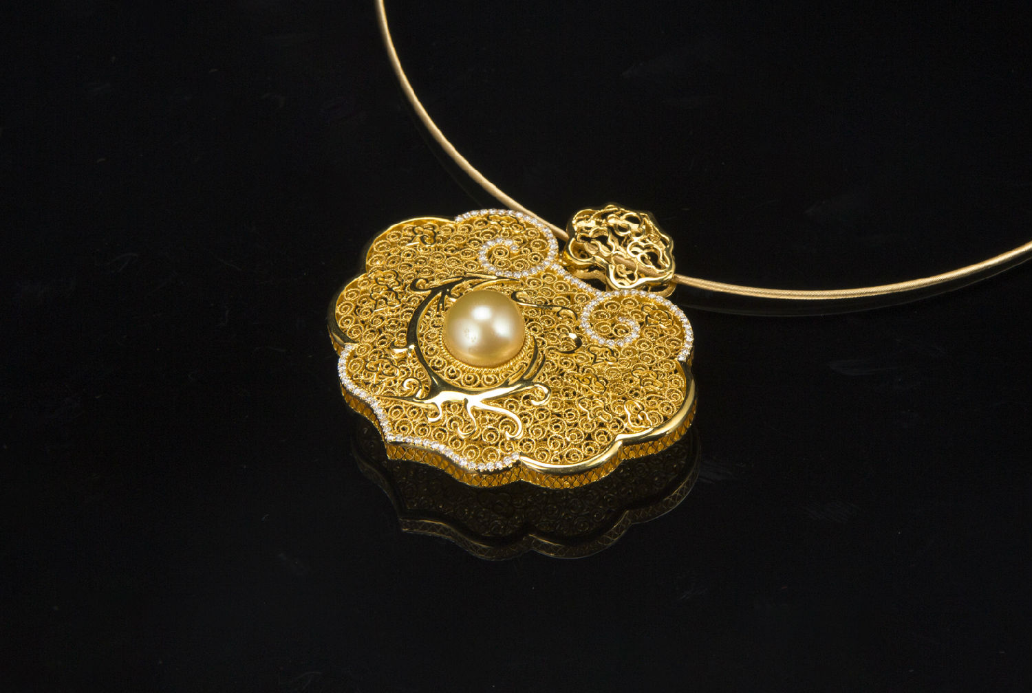 Style:Filigree Inlay Necklace 18K Gold Natural South Sea Golden Pearls Diamonds