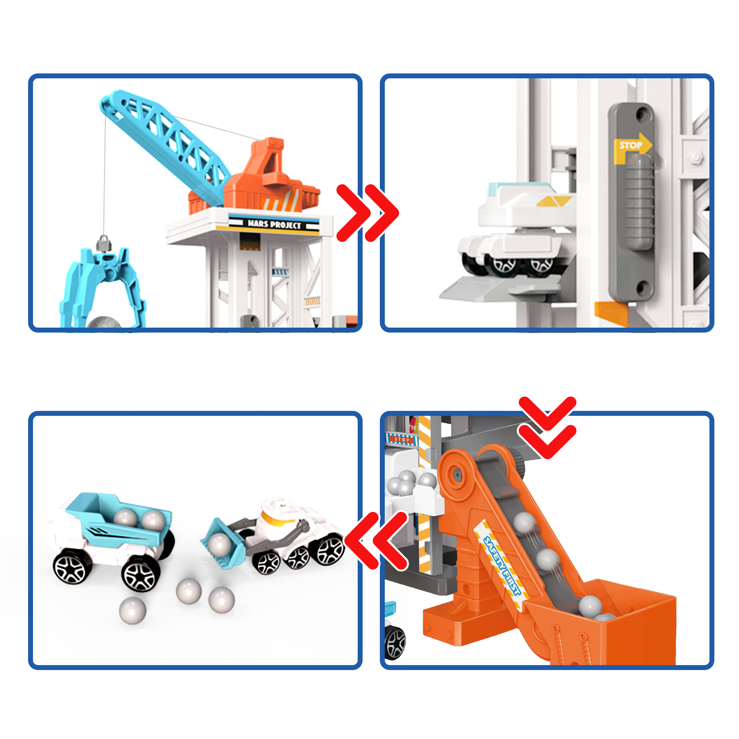 3, Rotary control crane, manual lifting platform, material conveyor belt, organ slide, slope slide, material transportation, loading, etc., busy construction site, let children experience more real.