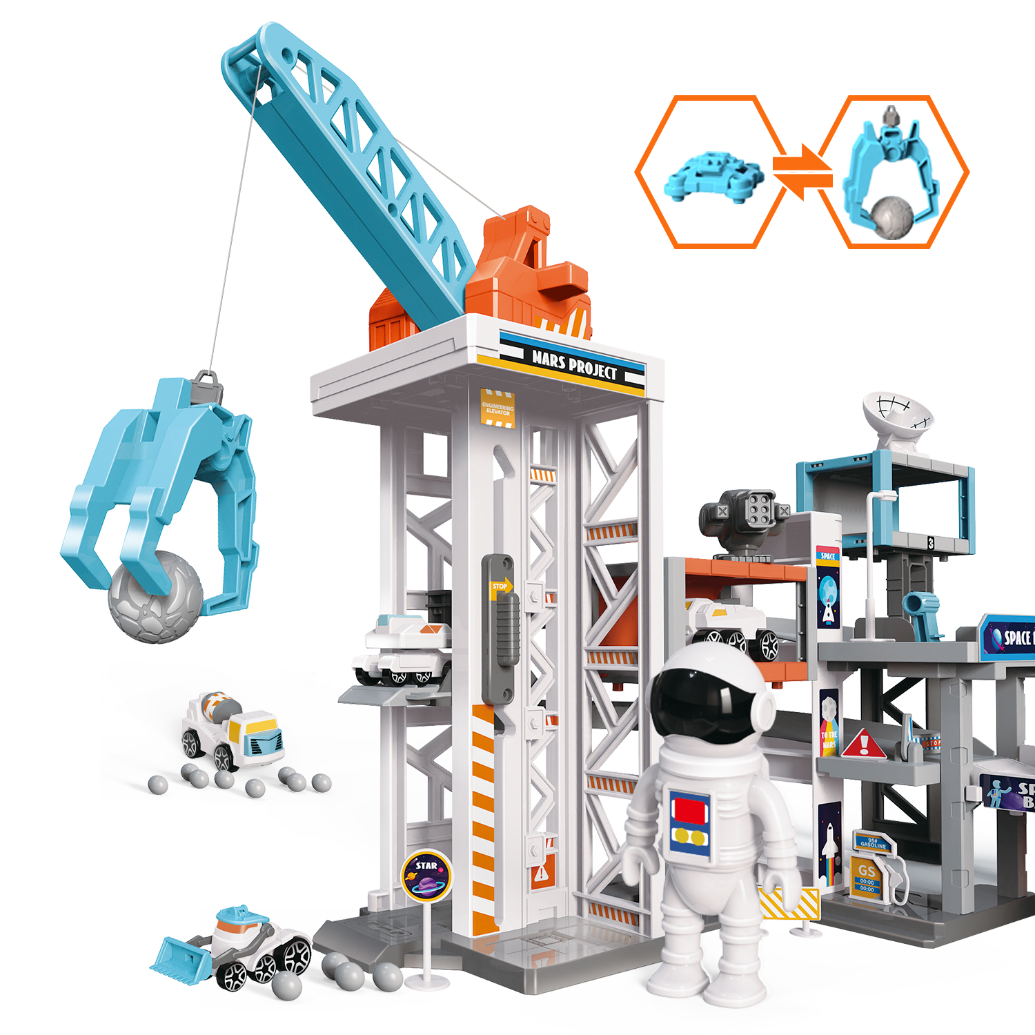 2, Equipped with 6 theme cars, 2 astronauts, let the children experience more real. Create a realistic experience.