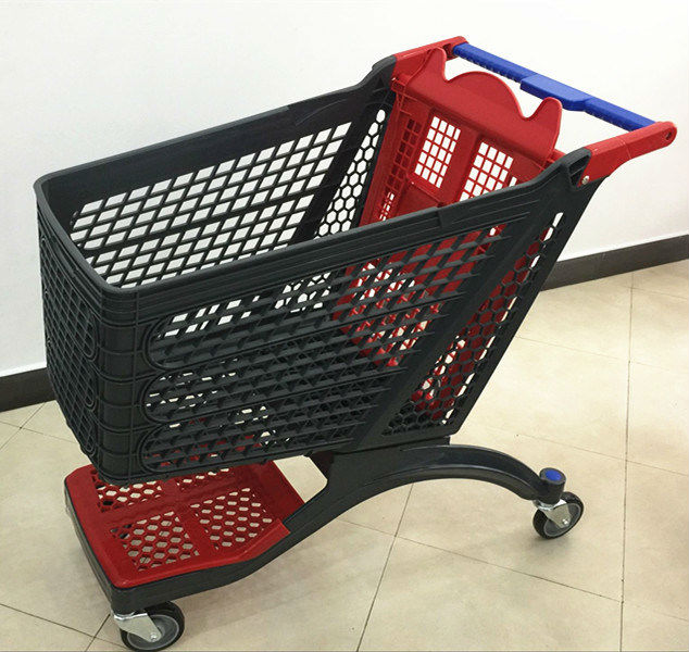 The shopping cart is made of Nylon, PVC & PU. It is made of 100% recyclable plastic. All manufacturing scrap parts are reground at our factory and recycled into other products that we make which don't need virgin raw materials. Unlike the metallic shopping carts, no chrome plating processes are involved in the manufacturing of the Polycart, therefore it avoids entirely the use of chromic acid, hydrochloric acid, nickel chloride, nickel metal, nickel sulfate or sodium bisulphate and the corresponding residues. The manufacturing process of plastic injection molding involves and efficient and responsible use of water, which is only intended for the refrigeration of the moulds in a closed circuit. No toxic substance is ever dumped to the water.