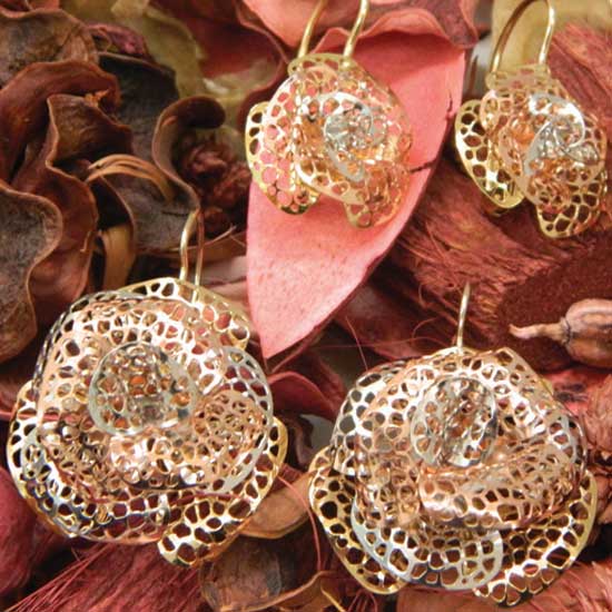 The earrings are made of a luxurious mix of yellow gold, white gold and rose gold. They are crafted with a stunning rose blossom design. The earrings are finished with delicate cutouts on their surfaces.