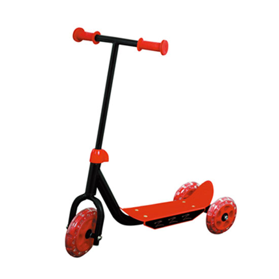 This is a three-wheeled scooter in bright red and black for an eye-catching look. It is made of quality plastic and steel for durability. This charming scooter is a great gift choice for your kids.