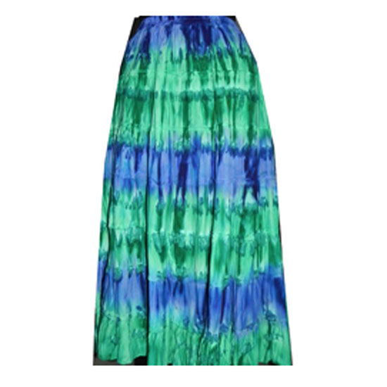 This is a long skirt designed in a pleasant summer style. The tiered skirt features horizontal stripes in alternative blue and green. This skirt looks great with any designs of tops or tees.