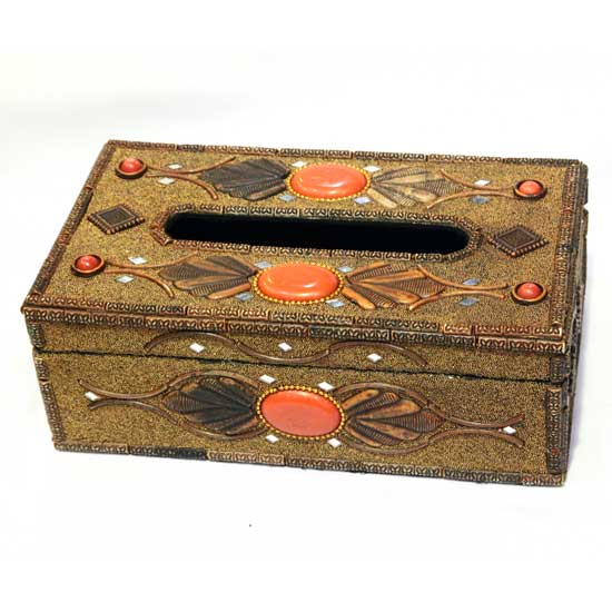 This tissue box boasts an antique style. It is crafted with fine stones in oval and round shapes. The rough surface features numerous tiny stones. The edges come with patterned strips for added aesthetic value.