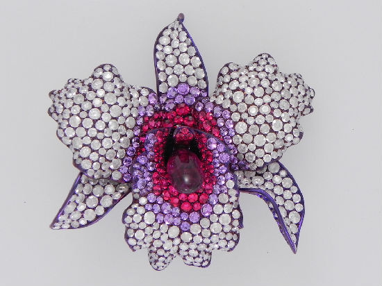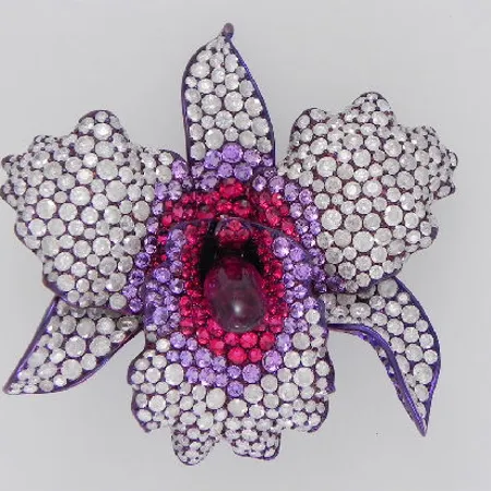 This flower-shaped brooch features a micro-paved purple sapphires, pink spinel and milky diamonds with a rubellite center. The tiny white diamonds add sparkle to the piece. The delicate flower brooch is perfect to accessorize any formal wear.