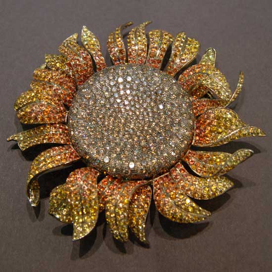 Featured here is a brooch in a shape of a sunflower. It is made with fine craftsmanship. The brown diamonds add a touch of elegance to the refined shading of yellow to orange sapphires.
