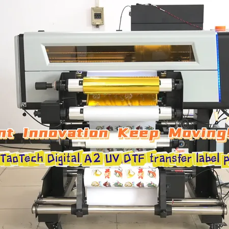 Titanjet UV DTF can do with foil for golden stickers & color stickers and DTF Printers can do with PET Film with CMYK +W + ORGB + Fluorescent color on T-shirt