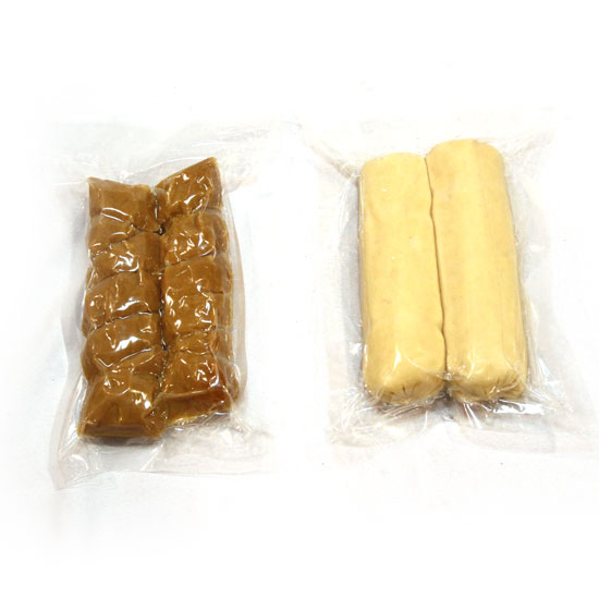 The tofu chicken is made with bunched tofu skin to imitate the taste of chicken breast. It has a slightly rubbery texture with a salty flavor. The tofu chicken is often used as meat substitute in vegetarian cuisines.