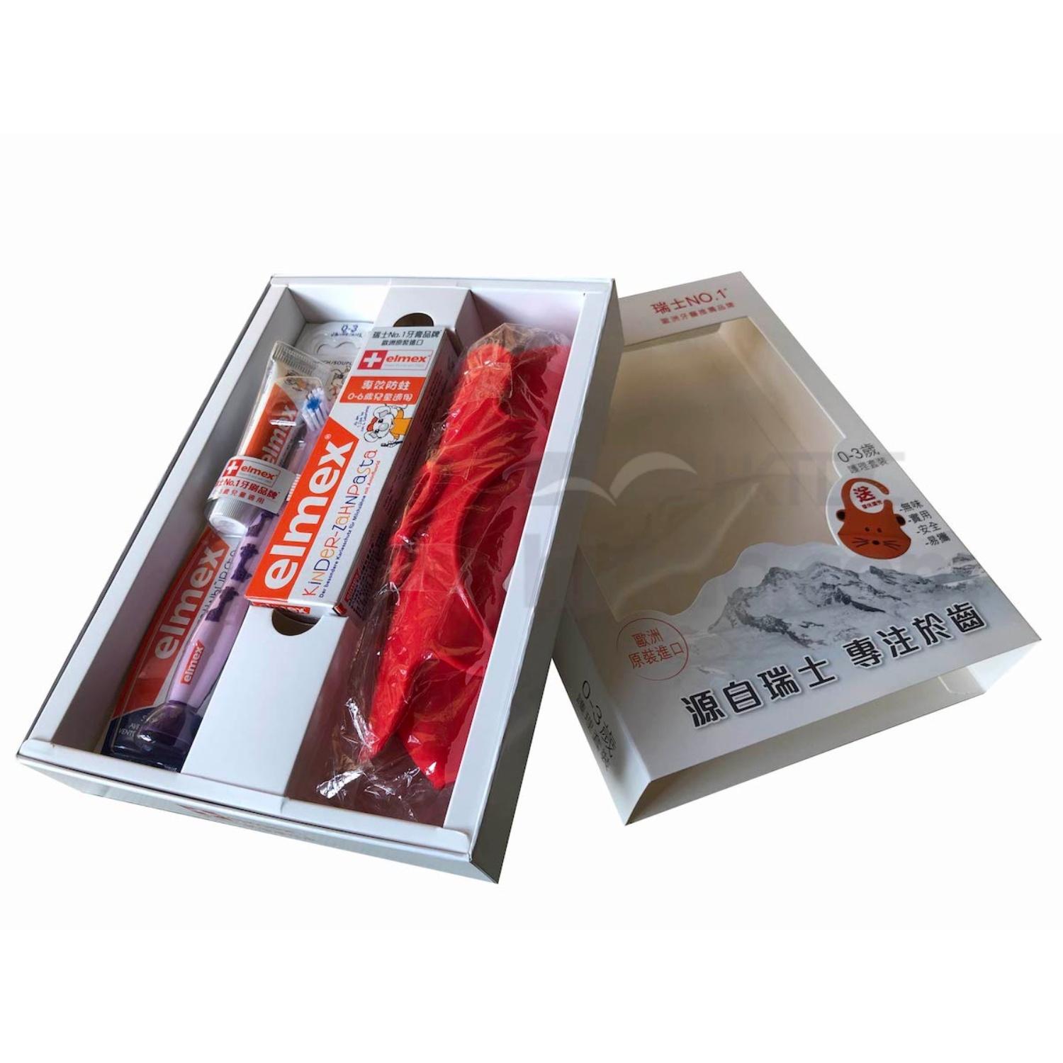 Remarks: this box is designed for children toothpaste and brush packing. There is a clear window on front panel to show through the products. Using 2 stickers to fix at both ends prevent inner tray moving out.