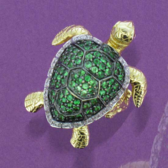 The jewelry piece showcases a vivid tortoise image. The tortoise jewelry is beautifully decorated with shining diamonds in green color on the back. The claws of the tortoise are completed in gold finish.
