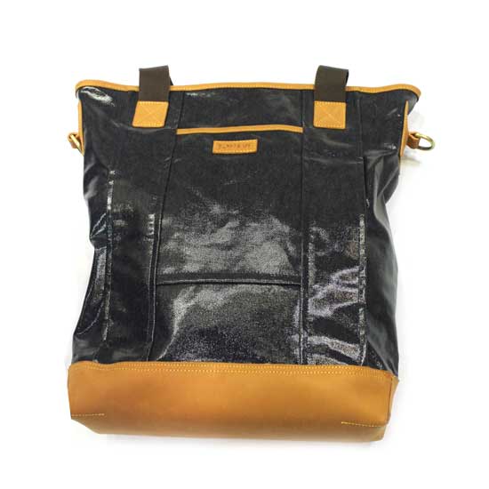 This fashionable tote bag in black and brown is made of denim with a PVC coating for sturdiness. It is fitted with a leather base for a contrasting touch. This waterproof tote bag is no doubt to last for a long time.