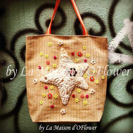 Displayed is a tote bag that comes in a unique design. Featuring a furry starfish image on the front, this tote bag is made of mixed fabrics for a good touch. This stylish tote bag is a good choice for the weekend.