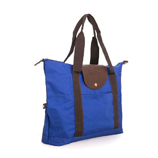 This is a stylish tote bag that features a two-toned look in brown and blue. It comes with two top handles and a large main compartment. This tote bag is secured with a classic zippered closure.
