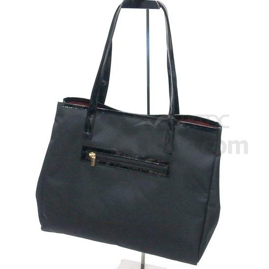 The pictured tote bag has a microfiber body with patent PVC trim and has a magnetic snap closure on top. It has a zipped pocket in the front and has a gold coil nylon zipper for smooth pulling. This classy and durable tote bag has two handles on top for carrying and is great for promotion use.