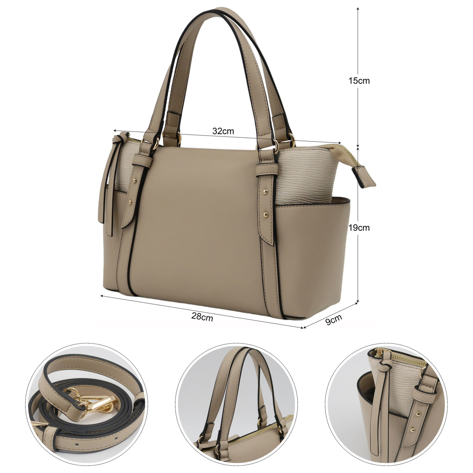 1. Material: PU2. Handle: 15cm3. Size: 28/32cm x 19cm x 9cm4. Shoulder Strap Length: 60cm5. Weight: about 0.38kg