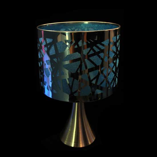This touch table lamp features a drum-shaped lamp shade with random cut-out shapes. A colorful layer of material is added underneath the lamp shade to deliver fancy lighting effects. The cone shaped lamp base adds a modern touch to this lamp.