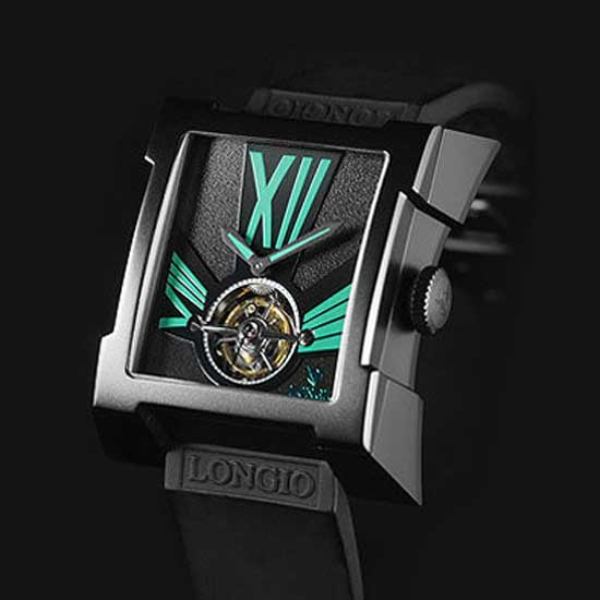 This is a tourbillon watch that boasts a cool and fashionable design. It features a black DLC watch case designed in a streamlined and unique shape. The black dial with bright green Roman numbers and dials highlights this watch in a distinctive way.