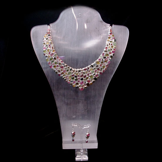 Displayed is a tourmaline jewelry set coming in a sterling silver setting. It consists of a pair of earrings and a necklace. The necklace is well studded with multi-colored tourmalines for added grace and charm.