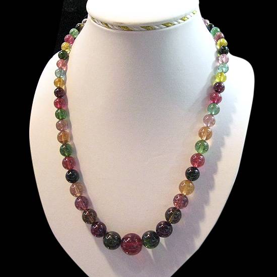 This is a tourmaline bead necklace for ladies and women. It is threaded with round tourmaline beads in graduated sizes and assorted colours, such as green, purple, red, orange, yellow and blue. The colourful necklace shows a stylish and vibrant look which every lady will fall in love with.