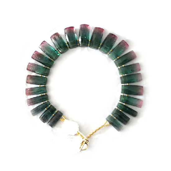 This is an eye-catching necklace that is finely strung with bicolor tourmaline stones. Each tourmaline stone is masterfully cut and polished to offer charming luster. This necklace will add a touch of glamor to your high-fashion outfit.