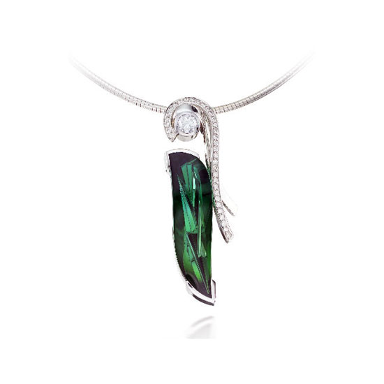 This is an elegant pendant that is made of 18-karat white gold. It is accented with a tourmaline gemstone and allover dazzling diamonds. This gorgeous pendant will add a touch of glamor to your outfit.