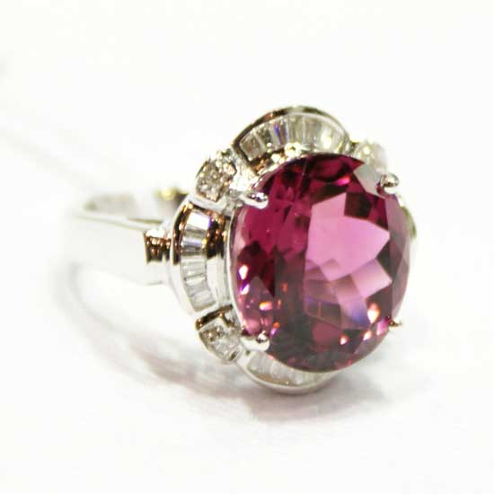 Highlighted here is a round-shaped ring that is adorned with a refined pink tourmaline. The ring comes in an 18K white gold setting that is embellished with loose diamonds, showcasing a sense of elegance. This pink tourmaline ring complements your elegant look nicely.