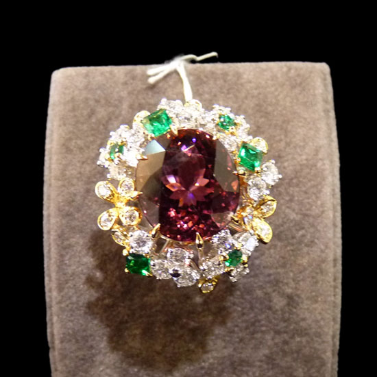 This oversized ring features a faceted reddish tourmaline as the centerpiece, gorgeous and beautiful. Carefully adorned with diamonds and emeralds, this floral-shaped ring shines dynamically. Exhibiting excellent craftsmanship, this precious tourmaline ring is just a masterpiece.
