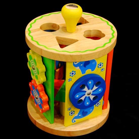 Pictured is a toy block set with components encased in a cylindrical-shaped container. It comes with wooden blocks completed with vibrant colors. The top of the container features different shaped cutouts that you have to fill them with matching blocks.