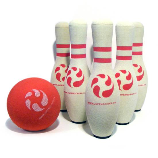 The featured item is a toy bowling set. The set includes a bowling ball and six bowling pins, and it would provide much entertainment for children.